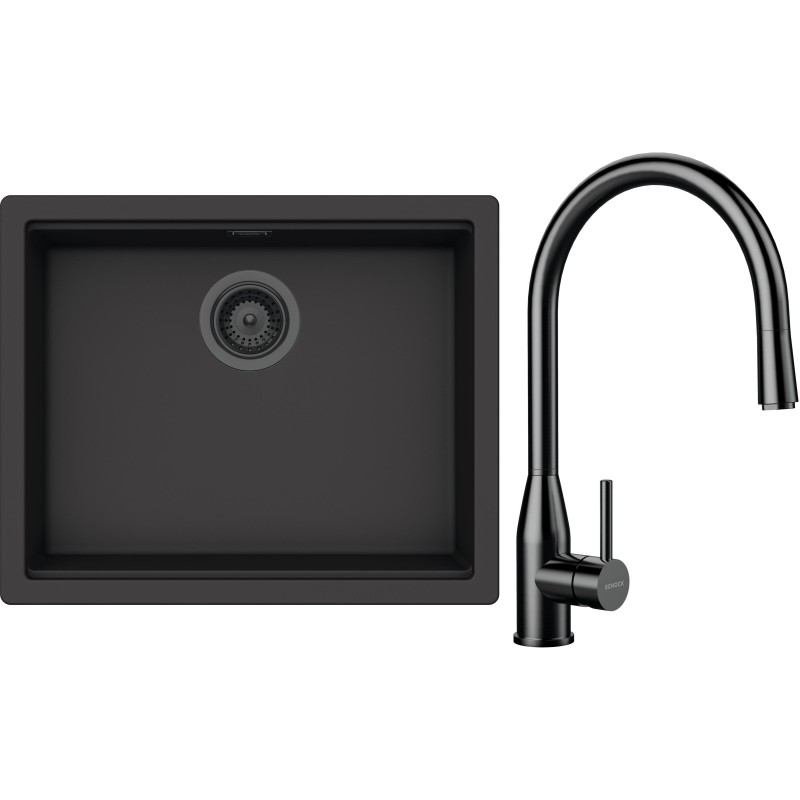 Cenově zvýhodněný set dřezu a baterie Schock S32-10 - obsahuje granitový jednodřez Kiruna N-100L Dusk, baterii s vytahovací koncovkou Kavus.120 Gunmetal brushed a části dřezu v provedení Gunmetal brushed.