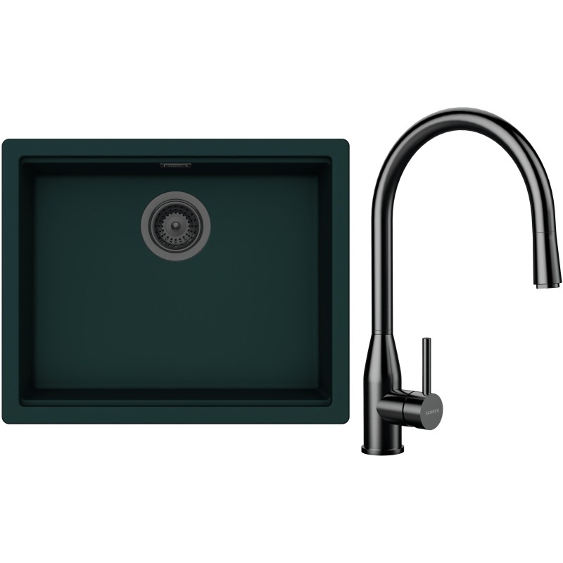 Cenově zvýhodněný set dřezu a baterie Schock S32-10 - obsahuje granitový jednodřez Kiruna N-100L Ivy, baterii s vytahovací koncovkou Kavus.120 Gunmetal brushed a části dřezu v provedení Gunmetal brushed.