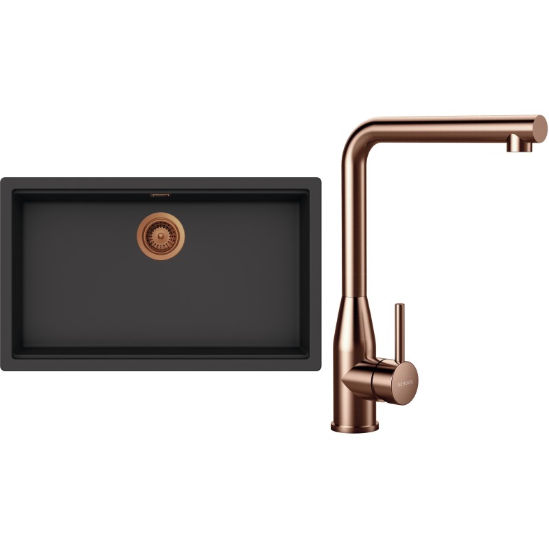 Cenově zvýhodněný set dřezu a baterie Schock S33-14 - obsahuje granitový jednodřez Kiruna N-100XL Dusk, baterii Keto Copper brushed a části dřezu v provedení Copper brushed.