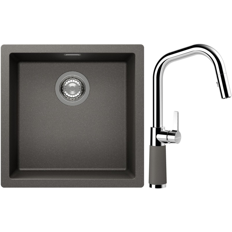 Cenově zvýhodněný set dřezu a baterie Schock S13-9 - obsahuje granitový jednodřez Kaia N-100 Silverstone a baterii se sprchou SC-530.120 Silverstone.