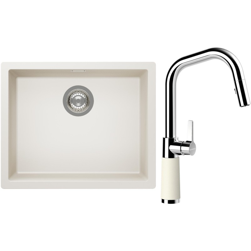 Cenově zvýhodněný set dřezu a baterie Schock S14-9 - obsahuje granitový jednodřez Kaia N-100L Magnolia a baterii se sprchou SC-530.120 Magnolia.