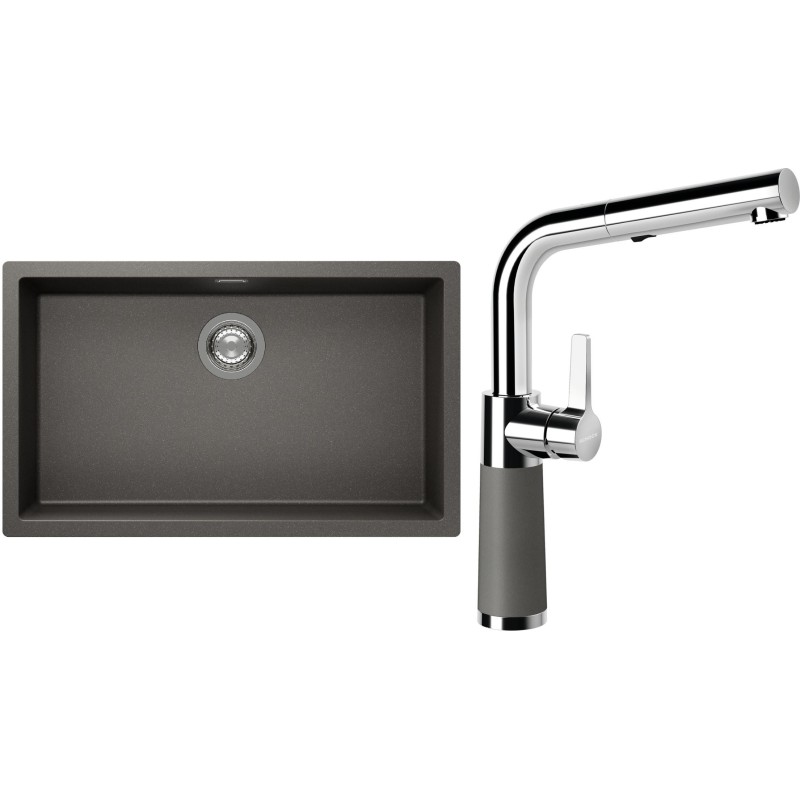 Cenově zvýhodněný set dřezu a baterie Schock S15-11 - obsahuje granitový jednodřez Kaia N-100XL Silverstone a baterii se sprchou SC-540.120 Silverstone.