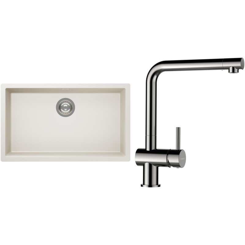 Cenově zvýhodněný set dřezu a baterie Schock S15-3 - obsahuje granitový jednodřez Kaia N-100XL Magnolia a baterii Epos Nerezový vzhled.