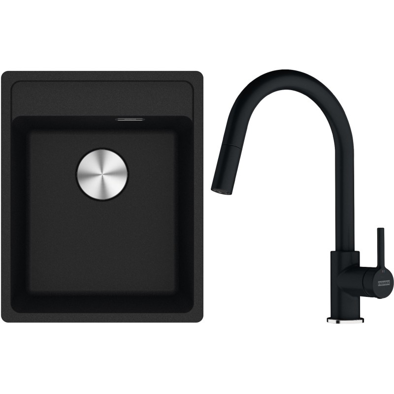 Cenově zvýhodněný set Franke G293O obsahuje granitový dřez jednodřez MRG 610-37 RTL Onyx a baterii s vytahovací koncovkou FC 6051.071 LINA Onyx.