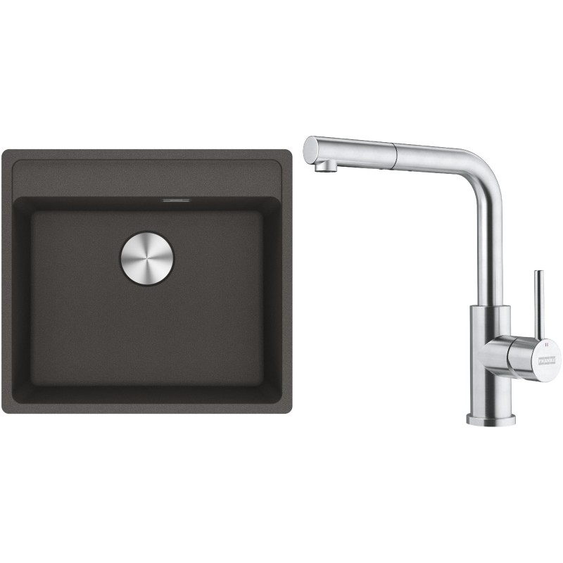 Cenově zvýhodněný set Franke G298ŠB obsahuje granitový dřez jednodřez MRG 610-52 RTL Šedá břidlice a baterii s vytahovací koncovkou FC 6986.501 SMART GLENDA Celonerez.