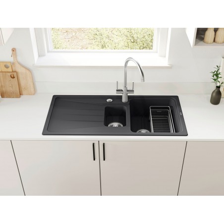 Granitový dřez s vaničkou a odkapem, provedení Šedá skála, otočný, rozměr 1 000 x 500 mm, vana 350 x 420 x 190 mm a 165 x 255 mm, horní montáž, minimálně 60 cm skříňka.