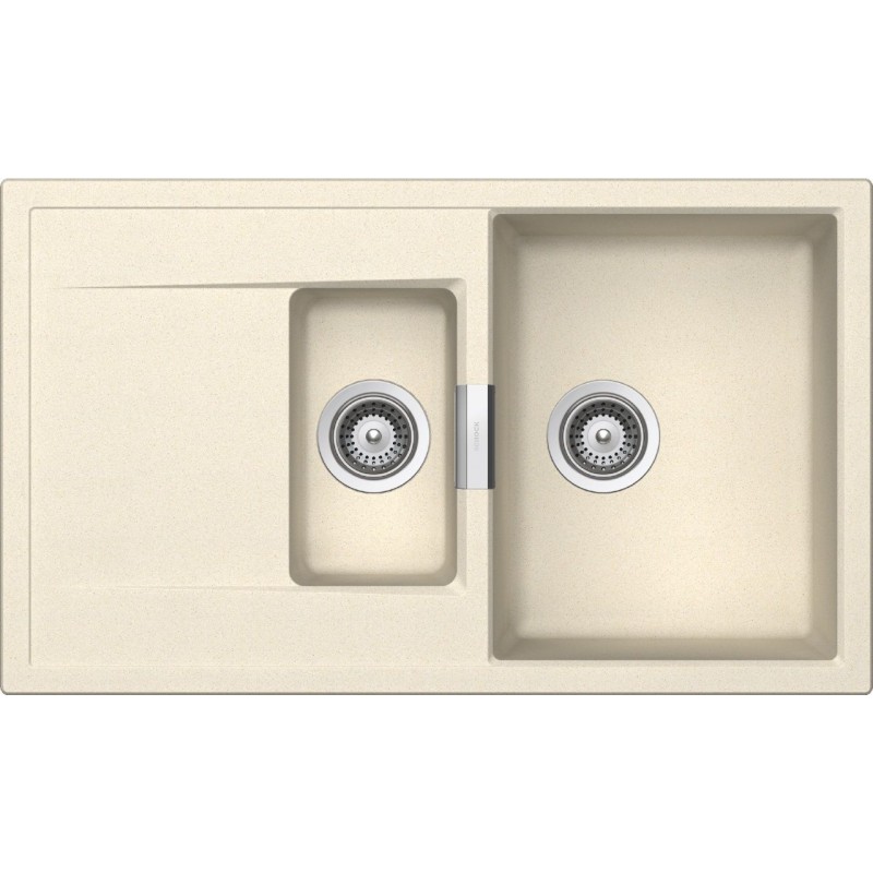 Granitový dřez s vaničkou a odkapem, provedení Magnolia, otočný, rozměr 860 x 510 mm, vana 339 x 440 x 200 mm a 165 x 294 x 120 mm, horní montáž, minimálně 60 cm skříňka, s excentrem.