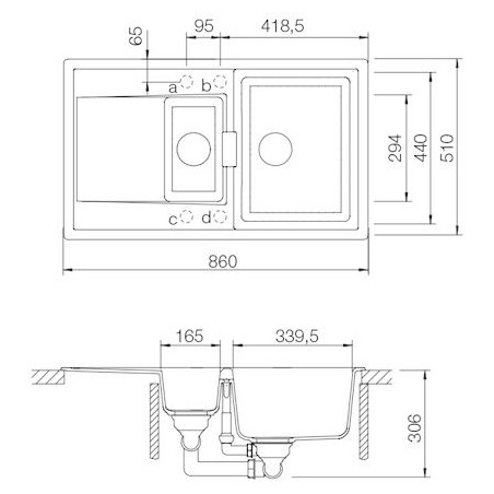 Granitový dřez s vaničkou a odkapem, provedení Stone, otočný, rozměr 860 x 510 mm, vana 339 x 440 x 200 mm a 165 x 294 x 120 mm, spodní montáž, minimálně 60 cm skříňka, s excentrem.