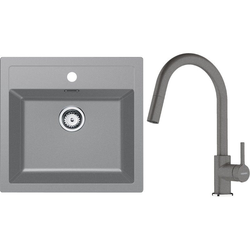 Cenově zvýhodněný set Franke T130Š obsahuje Tectonite dřez jednodřez SID 610 Šedá a baterii s vytahovací koncovkou FC 6051.084 LINA Šedý kámen.