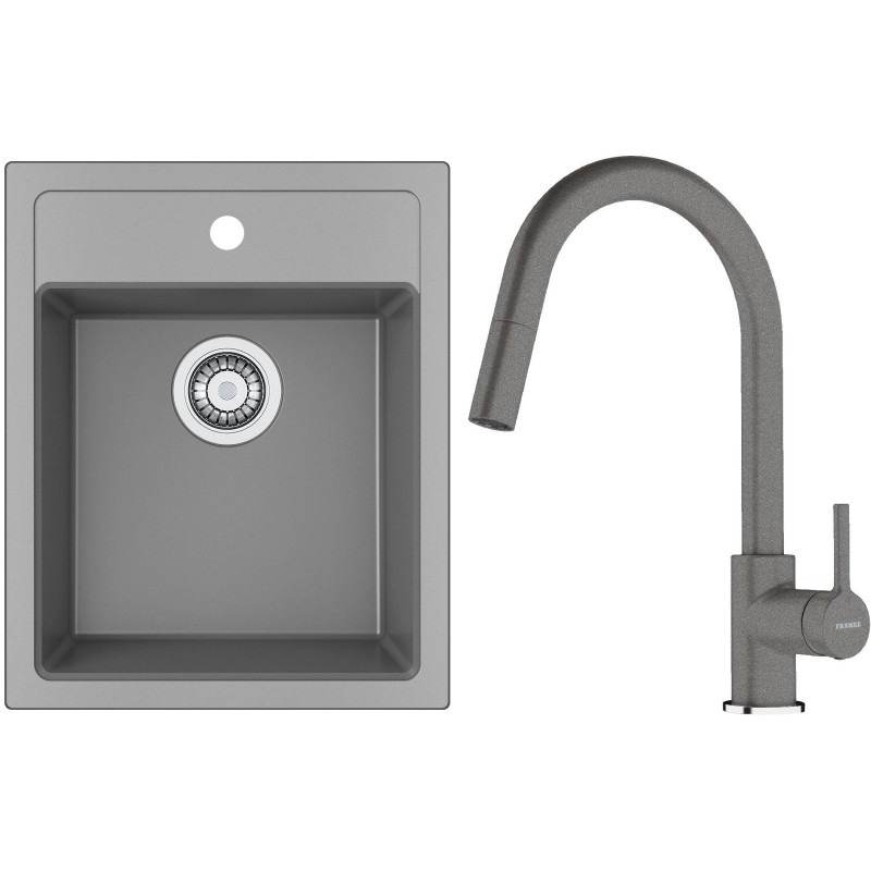 Cenově zvýhodněný set Franke T129Š obsahuje Tectonite dřez jednodřez SID 610-40 Šedá a baterii s vytahovací koncovkou FC 6051.084 LINA Šedý kámen.