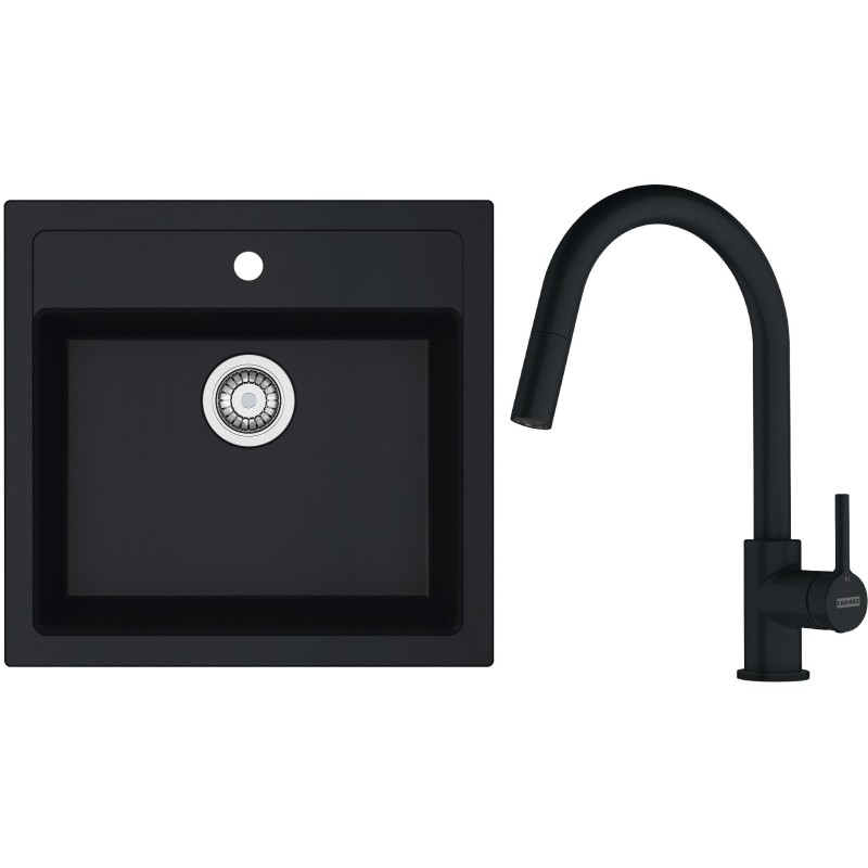 Cenově zvýhodněný set Franke T130Č obsahuje Tectonite dřez jednodřez SID 610 Černá a baterii s vytahovací koncovkou FC 6051.901 LINA Matná černá.
