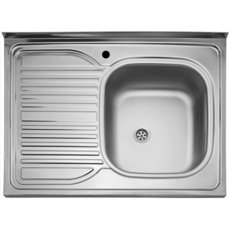 Nerezový celoplošný dřez - nahrazuje pracovní desku, plech 0,5 mm, matný, vana vpravo, rozměr 800 x 600 mm, vana 360 x 410 x 150 mm, minimálně 80 cm skříňka.