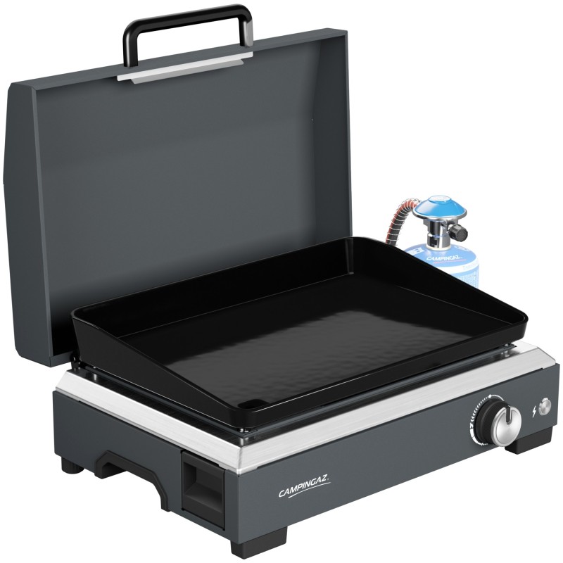 Ať už grilujete na balkóně nebo vaříte venku, Campingaz Plancha Sigma 1 CV je vaším perfektním společníkem pro nekomplikovanou zábavu s grilováním. Grilujte, chraňte a udržujte mastnotu pod kontrolou – multifunkční víko udržuje teplo, chrání před větrem a stříkající vodou a slouží jako robustní kryt při skladování. Tato předem sestavená plynová plancha je připravena k použití ihned po vybalení z krabice a je poháněna kompaktní plynovou kartuší Campingaz CV 470 Plus – ideální pro spontánní grilování! Vysoce kvalitní hořák z nerezové oceli Blue Flame zajišťuje rovnoměrné rozložení tepla po celé grilovací ploše. To zaručuje perfektní výsledky pokaždé – od šťavnatého masa až po křupavou zeleninu. Robustní smaltovaná litinová grilovací deska o rozměrech 30 x 45 cm (1 350 cm?) poskytuje dostatek grilovacího prostoru. Čištění je také neuvěřitelně snadné: Tuk a zbytky jídla stékají přímo do odnímatelné nádoby na tuk, kterou lze mýt v myčce nádobí, přes integrovaný odtokový otvor v desce plancha – pro čisté grilování bez námahy.