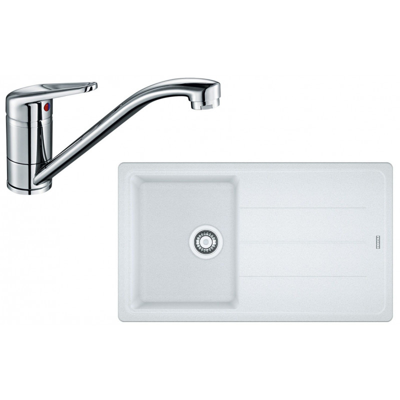 Cenově zvýhodněný set Franke G127 obsahuje granitový dřez s odkapem BFG 611-86 o rozměrech 860 x 500 mm v provedení Bílá led a baterii FC 9541.