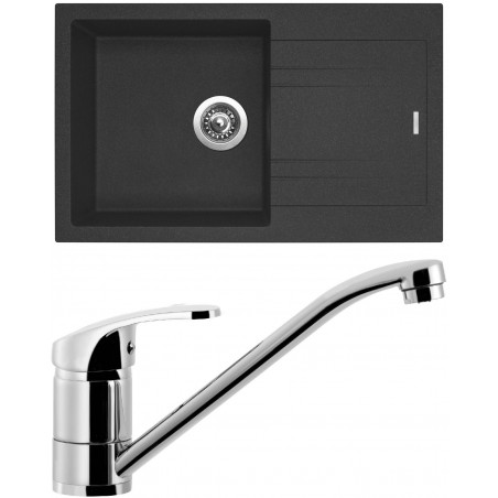 Cenově zvýhodněný set dřezu a baterie Sinks - obsahuje granitový dřez s odkapem Linea 780 Granblack 30 a baterii Pronto Chrom - lesklý.