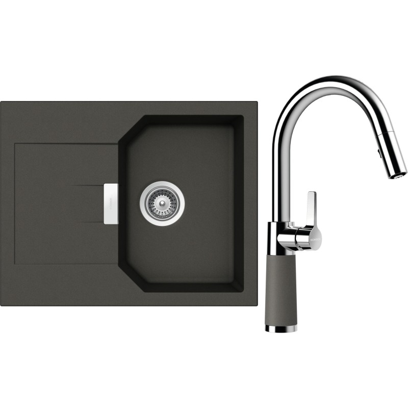Cenově zvýhodněný set dřezu a baterie Schock S18-9 - obsahuje granitový dřez s odkapem Manhattan D-100XS Asphalt a baterii se sprchou SC-520.120 Asphalt.
