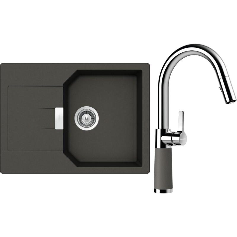 Cenově zvýhodněný set dřezu a baterie Schock S19-9 - obsahuje granitový dřez s odkapem Manhattan D-100S Asphalt a baterii se sprchou SC-520.120 Asphalt.