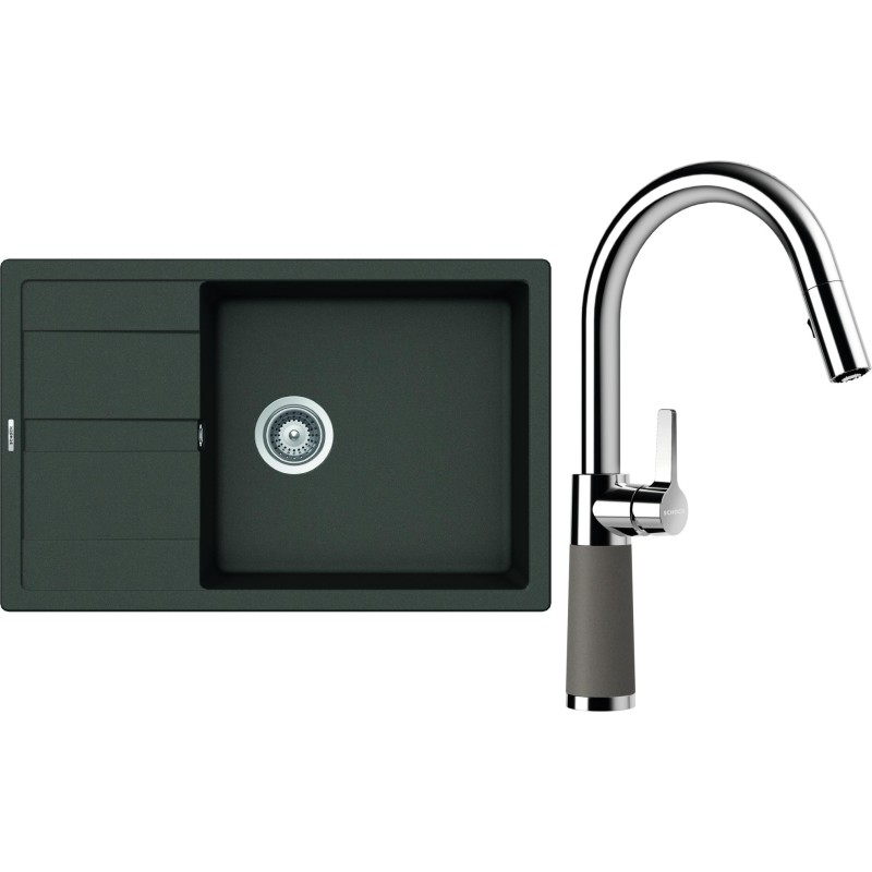Cenově zvýhodněný set dřezu a baterie Schock S22-9 - obsahuje granitový dřez s odkapem Manhattan D-100LS Asphalt a baterii se sprchou SC-520.120 Asphalt.