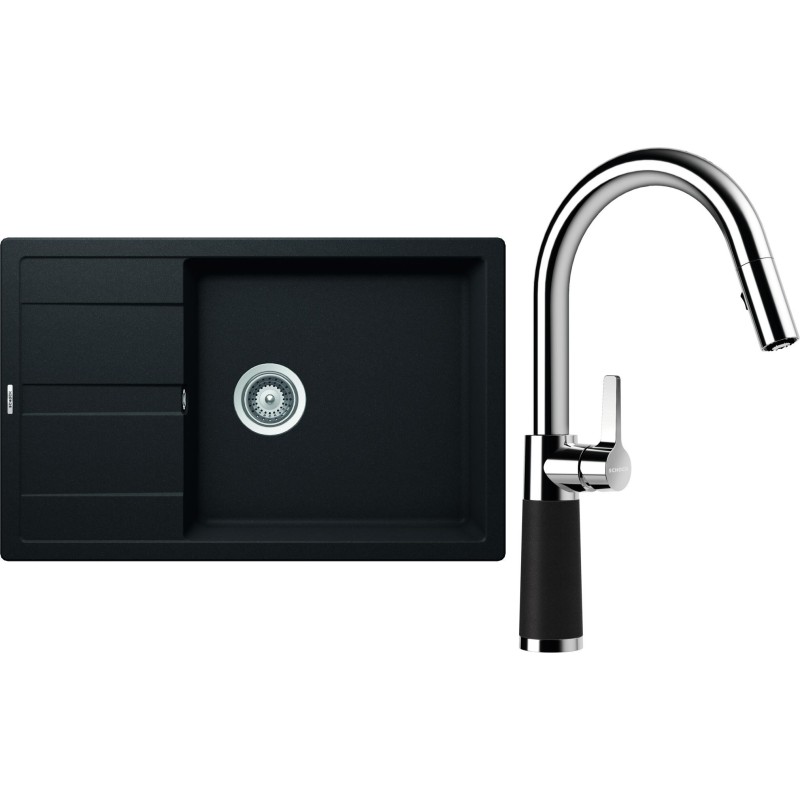 Cenově zvýhodněný set dřezu a baterie Schock S22-9 - obsahuje granitový dřez s odkapem Manhattan D-100LS Nero a baterii se sprchou SC-520.120 Nero.