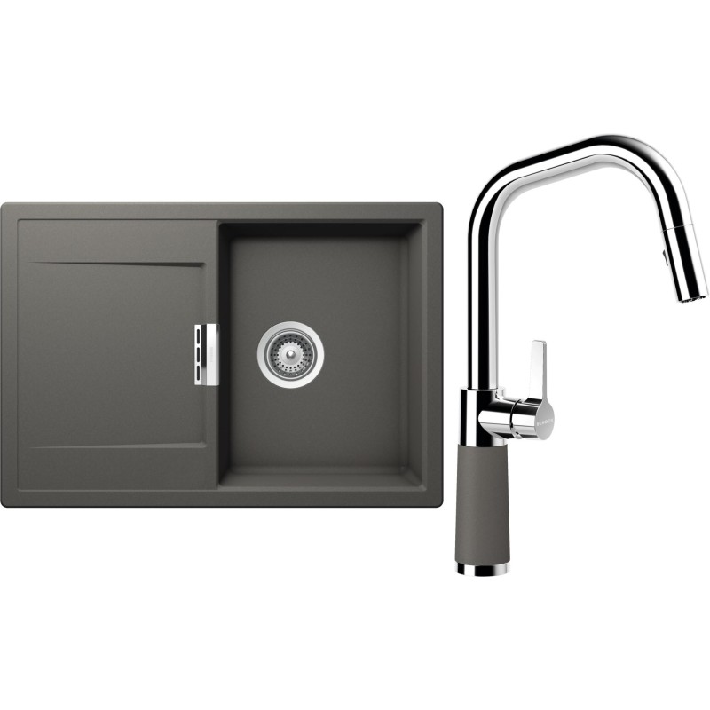 Cenově zvýhodněný set dřezu a baterie Schock S5-9 - obsahuje granitový dřez s odkapem Mono D-100S Silverstone a baterii se sprchou SC-530.120 Silverstone.