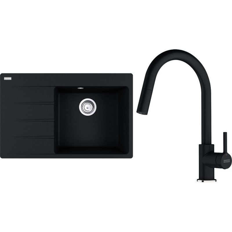 Cenově zvýhodněný set Franke G291O obsahuje granitový dřez s odkapem CNG 611-78 TL/7 Onyx a baterii s vytahovací koncovkou FC 6051.071 LINA Onyx.