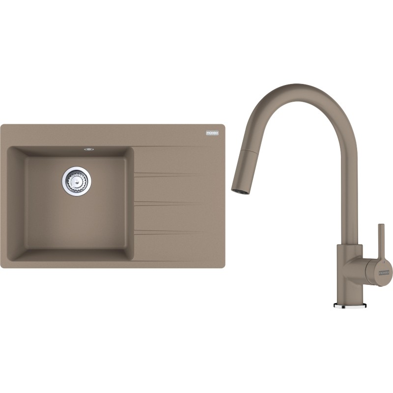 Cenově zvýhodněný set Franke G292KA obsahuje granitový dřez s odkapem CNG 611-78 TL/2 Kašmír a baterii s vytahovací koncovkou FC 6051.424 LINA Kašmír.
