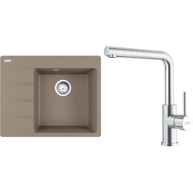 Cenově zvýhodněný set Franke G281KA obsahuje granitový dřez s odkapem CNG 611-62 TL/7 Kašmír a baterii FC 6985.501 SMART GLENDA Celonerez.