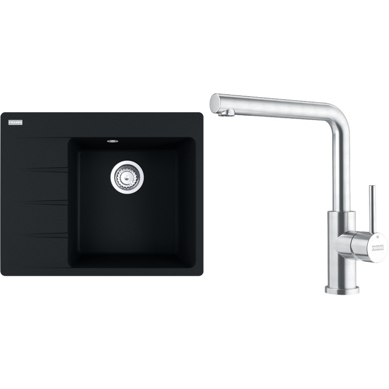 Cenově zvýhodněný set Franke G281O obsahuje granitový dřez s odkapem CNG 611-62 TL/7 Onyx a baterii FC 6985.501 SMART GLENDA Celonerez.