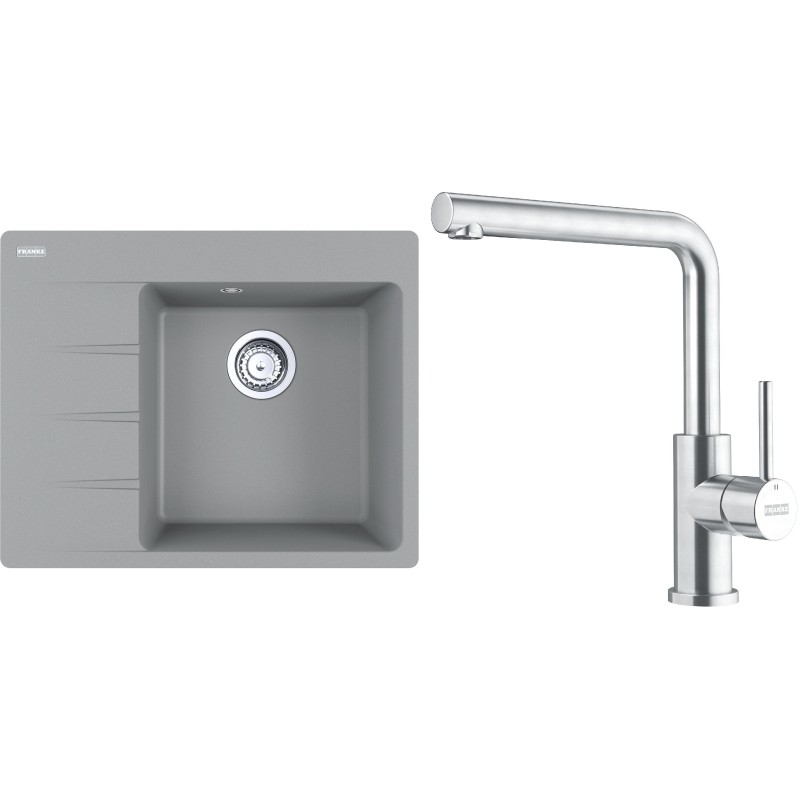 Cenově zvýhodněný set Franke G281ŠK obsahuje granitový dřez s odkapem CNG 611-62 TL/7 Šedý kámen a baterii FC 6985.501 SMART GLENDA Celonerez.
