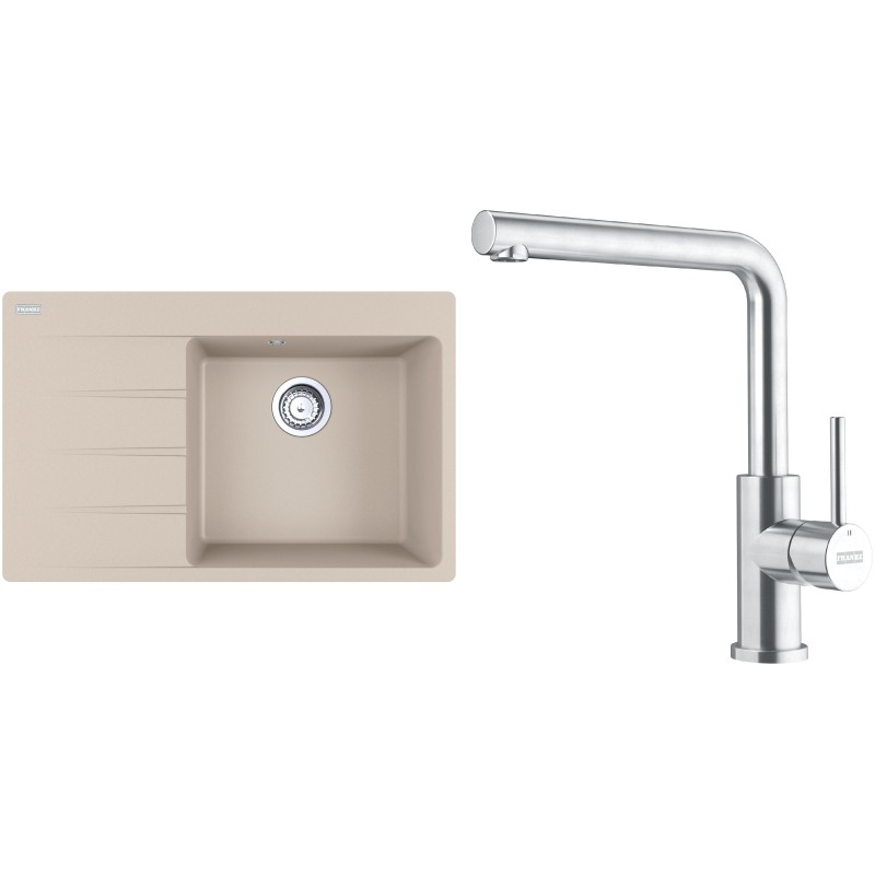 Cenově zvýhodněný set Franke G287SA obsahuje granitový dřez s odkapem CNG 611-78 TL/7 Sahara a baterii FC 6985.501 SMART GLENDA Celonerez.