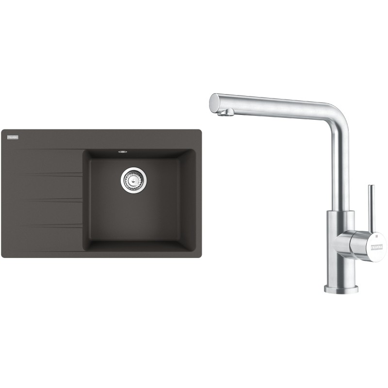 Cenově zvýhodněný set Franke G287ŠB obsahuje granitový dřez s odkapem CNG 611-78 TL/7 Šedá břidlice a baterii FC 6985.501 SMART GLENDA Celonerez.