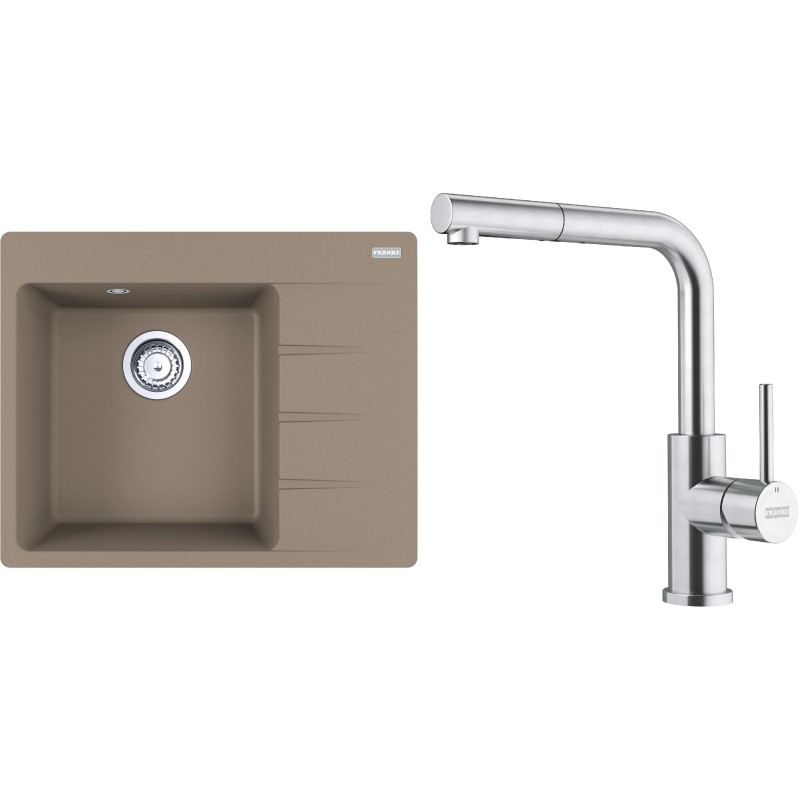 Cenově zvýhodněný set Franke G284KA obsahuje granitový dřez s odkapem CNG 611-62 TL/2 Kašmír a baterii s vytahovací koncovkou FC 6986.501 SMART GLENDA Celonerez.