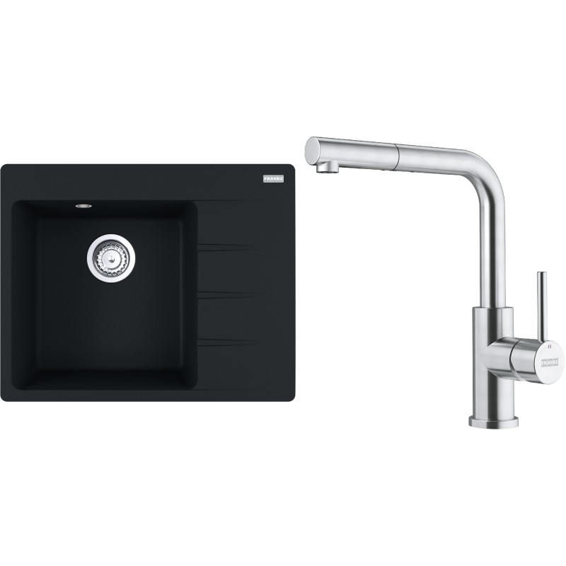 Cenově zvýhodněný set Franke G284MČ obsahuje granitový dřez s odkapem CNG 611-62 TL/2 Matná černá a baterii s vytahovací koncovkou FC 6986.501 SMART GLENDA Celonerez.