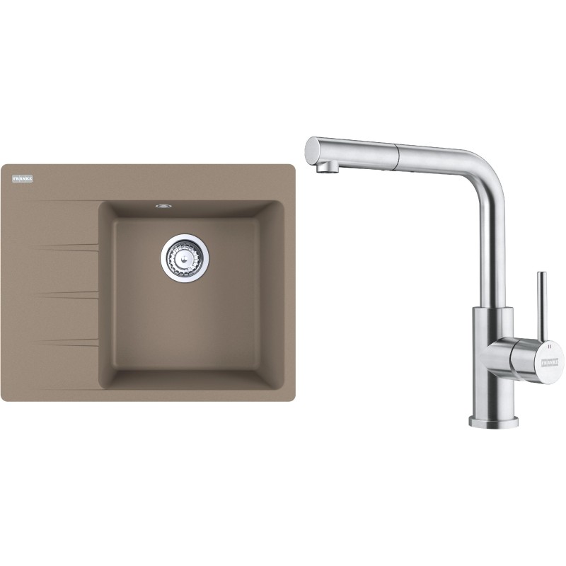 Cenově zvýhodněný set Franke G283KA obsahuje granitový dřez s odkapem CNG 611-62 TL/7 Kašmír a baterii s vytahovací koncovkou FC 6986.501 SMART GLENDA Celonerez.