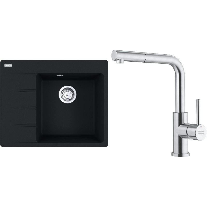Cenově zvýhodněný set Franke G283MČ obsahuje granitový dřez s odkapem CNG 611-62 TL/7 Matná černá a baterii s vytahovací koncovkou FC 6986.501 SMART GLENDA Celonerez.