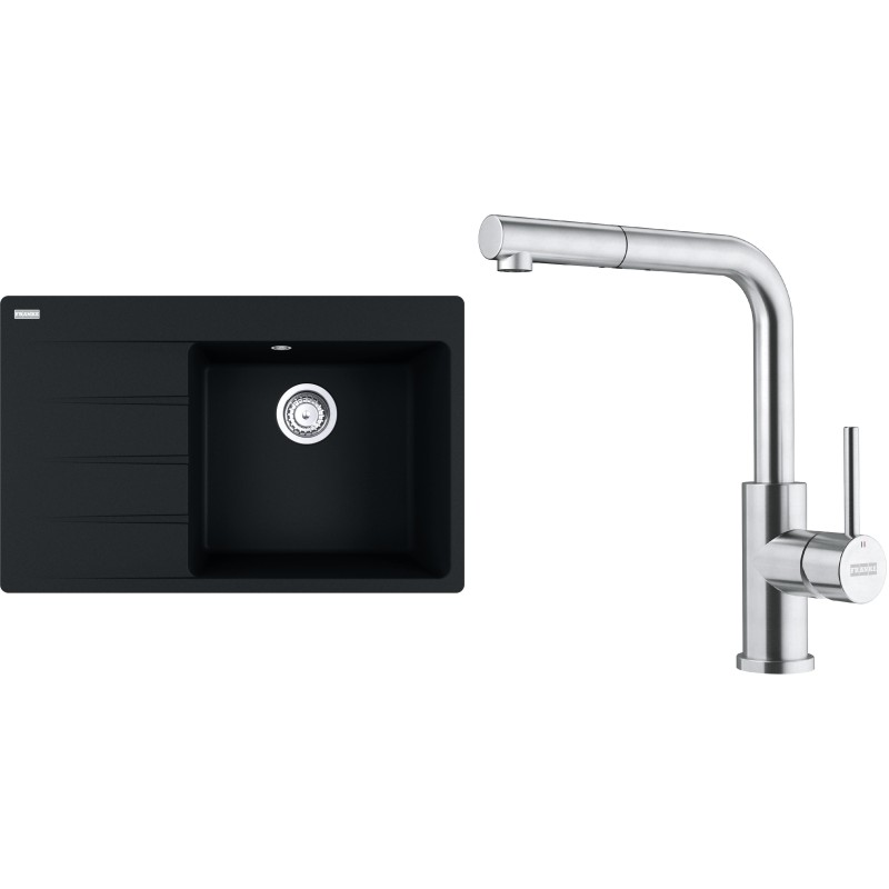 Cenově zvýhodněný set Franke G289O obsahuje granitový dřez s odkapem CNG 611-78 TL/7 Onyx a baterii s vytahovací koncovkou FC 6986.501 SMART GLENDA Celonerez.