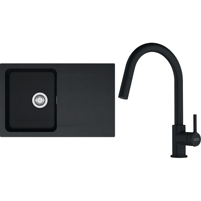 Cenově zvýhodněný set Franke T127Č obsahuje Tectonite dřez s odkapem OID 611-78 Černá a baterii s vytahovací koncovkou FC 6051.901 LINA Matná černá.