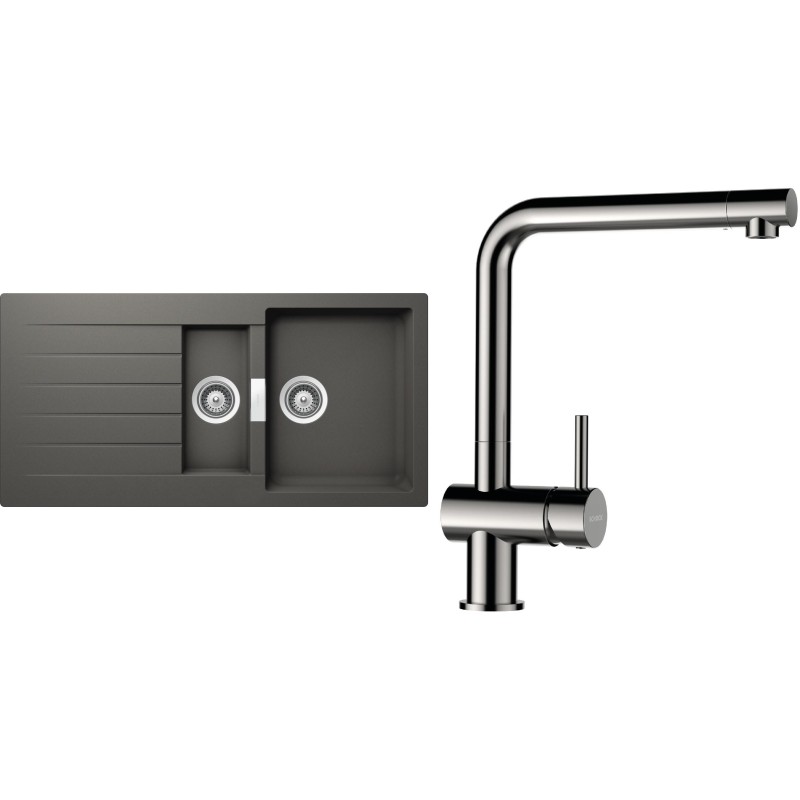 Cenově zvýhodněný set dřezu a baterie Schock S3-3 - obsahuje granitový dřez s vaničkou a odkapem Signus D-150 Silverstone a baterii Epos Nerezový vzhled.