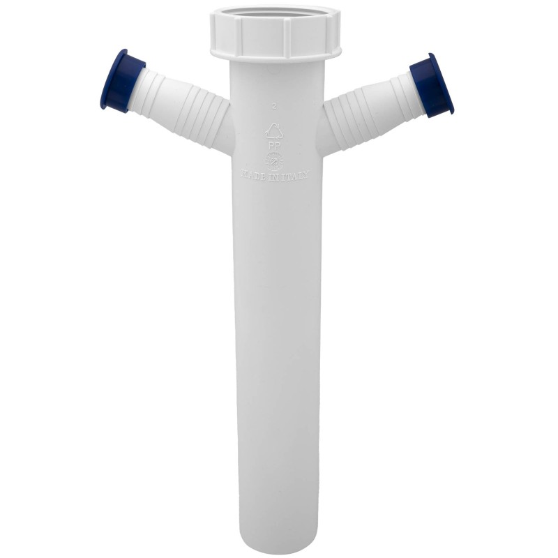 Rozdvojka sifonu, která umožňuje jednoduché napojení dvou spotřebičů na jeden odpad. Praktické řešení v případě, že máte pračku v kuchyni a k dispozici pouze jeden odpad. Modré záslepky lze sundat dle potřeby.